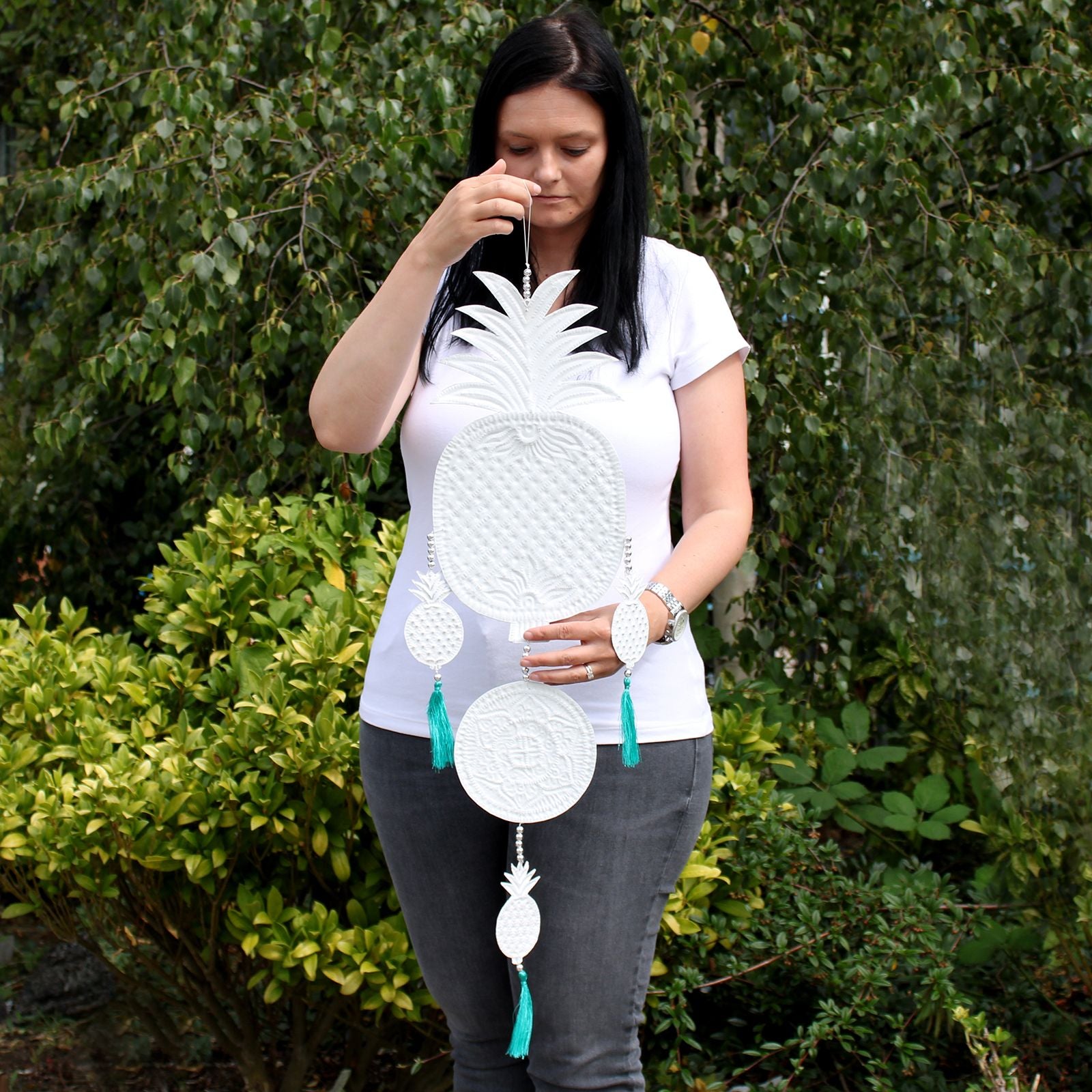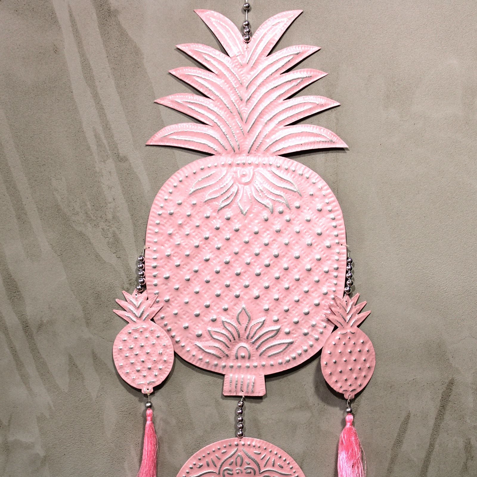 Lassen Sie sich von der faszinierenden Handwerkskunst Balis verzaubern. Dieses filigrane Wandmobile aus gehämmertem und handbemaltem Aluminium vereint traditionelle Techniken mit modernem, pastellfarbenem Design. Jede Ananas-Form ist ein liebevoll gestaltetes Unikat, verziert mit verspielten Perlen und handgeknoteten Baumwollquasten.