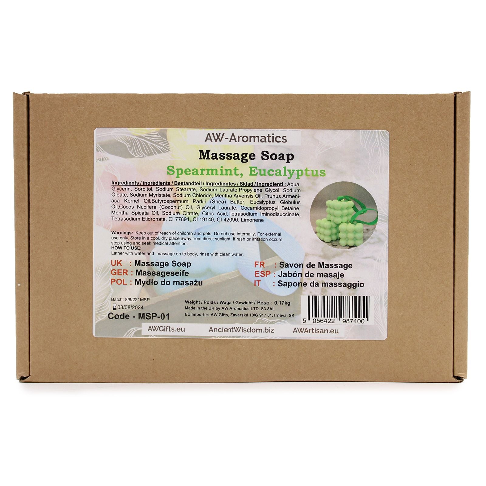 Unsere hochwertige Massageseife verbindet die intensive Pflege von Sheabutter, Kokosöl und Aprikosenkernöl mit dem erfrischenden Duft von Minze und Eukalyptus. Die sorgfältige Rezeptur reinigt die Haut sanft und spendet ihr zugleich wertvolle Feuchtigkeit.